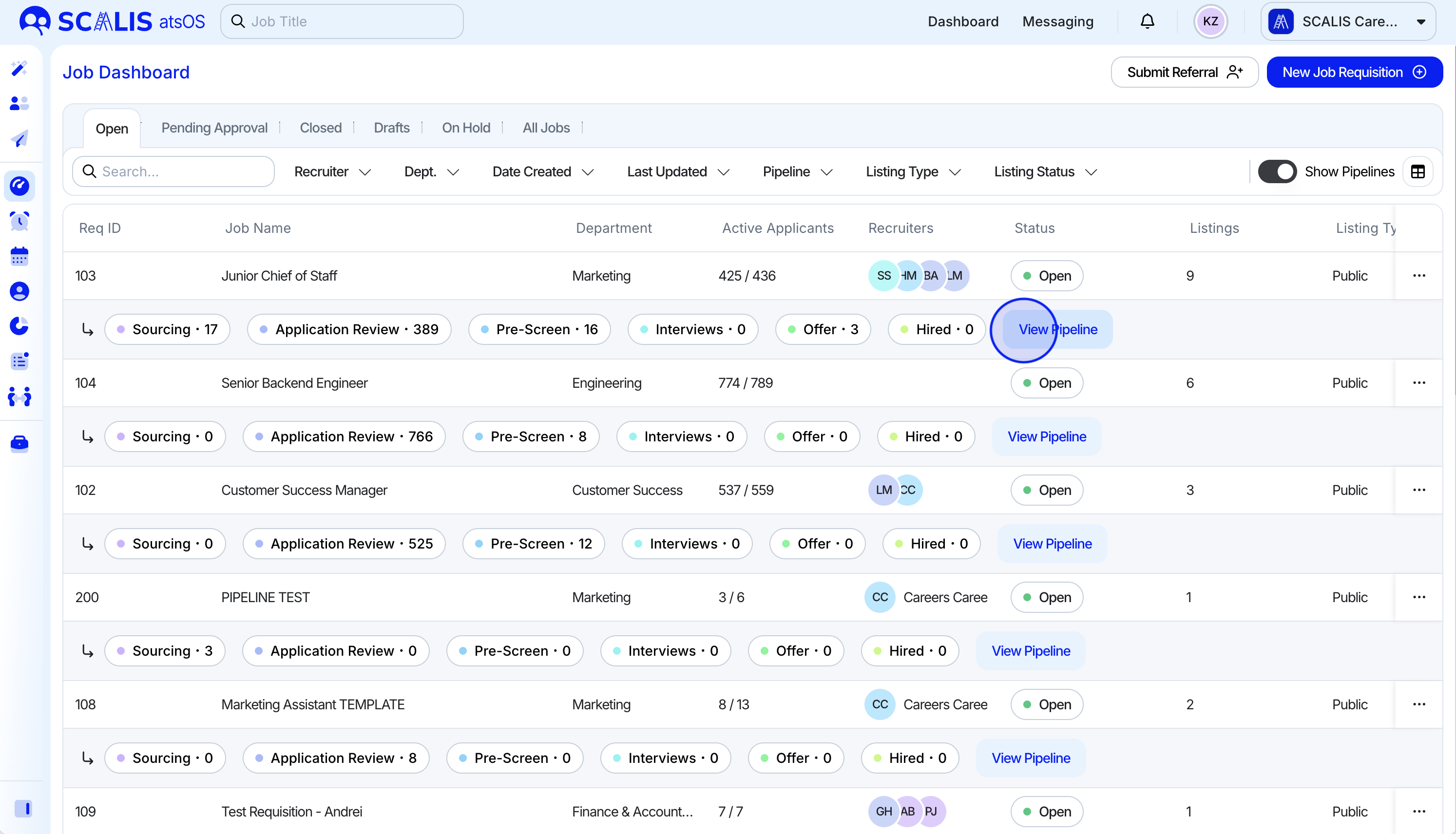 - Navigate to the Job Dashboard and click "View Pipeline" on a specific requisition.