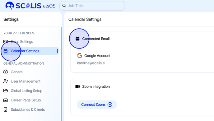 Make sure your Google or Outlook calendar is connected to your SCALIS account. Navigate to the Company Settings then click "Calendar Settings" and then "Connect Calendar".
