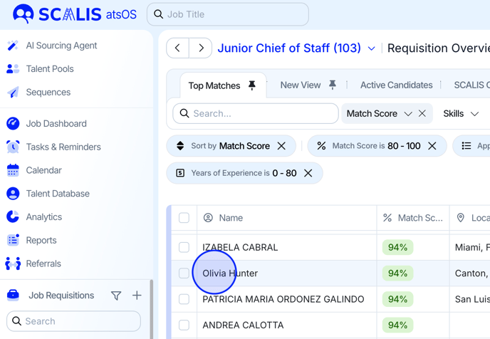 Click the candidate’s name. Their profile drawer will appear on the right.