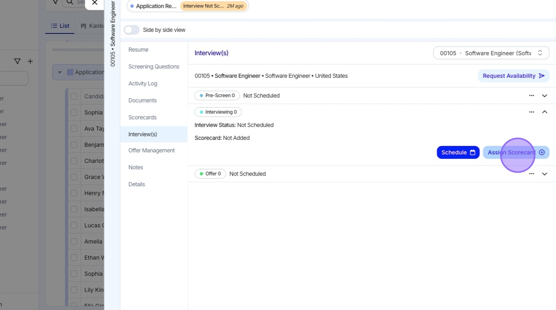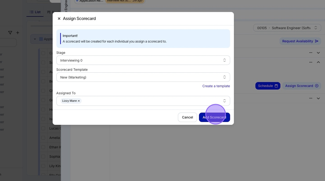 13. The Scorecard is now added to that stage, and you can view the completion status of the scorecard by hovering over the user avatar.