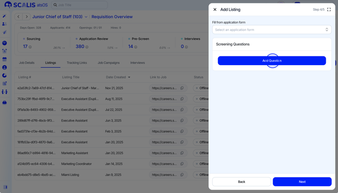 Next, start adding your screening questions by clicking the "Add Question" button. You can also select from an existing Application Form.