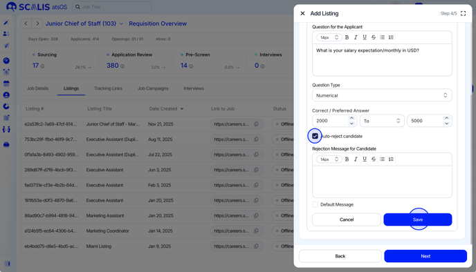 If you want this question to automatically reject applicants based on their answer, click the "Auto-Reject candidate" checkbox. You can also add an email template (by clicking "Default Message") or a custom message to send to the candidate if they get rejected. After finishing, click "Save".