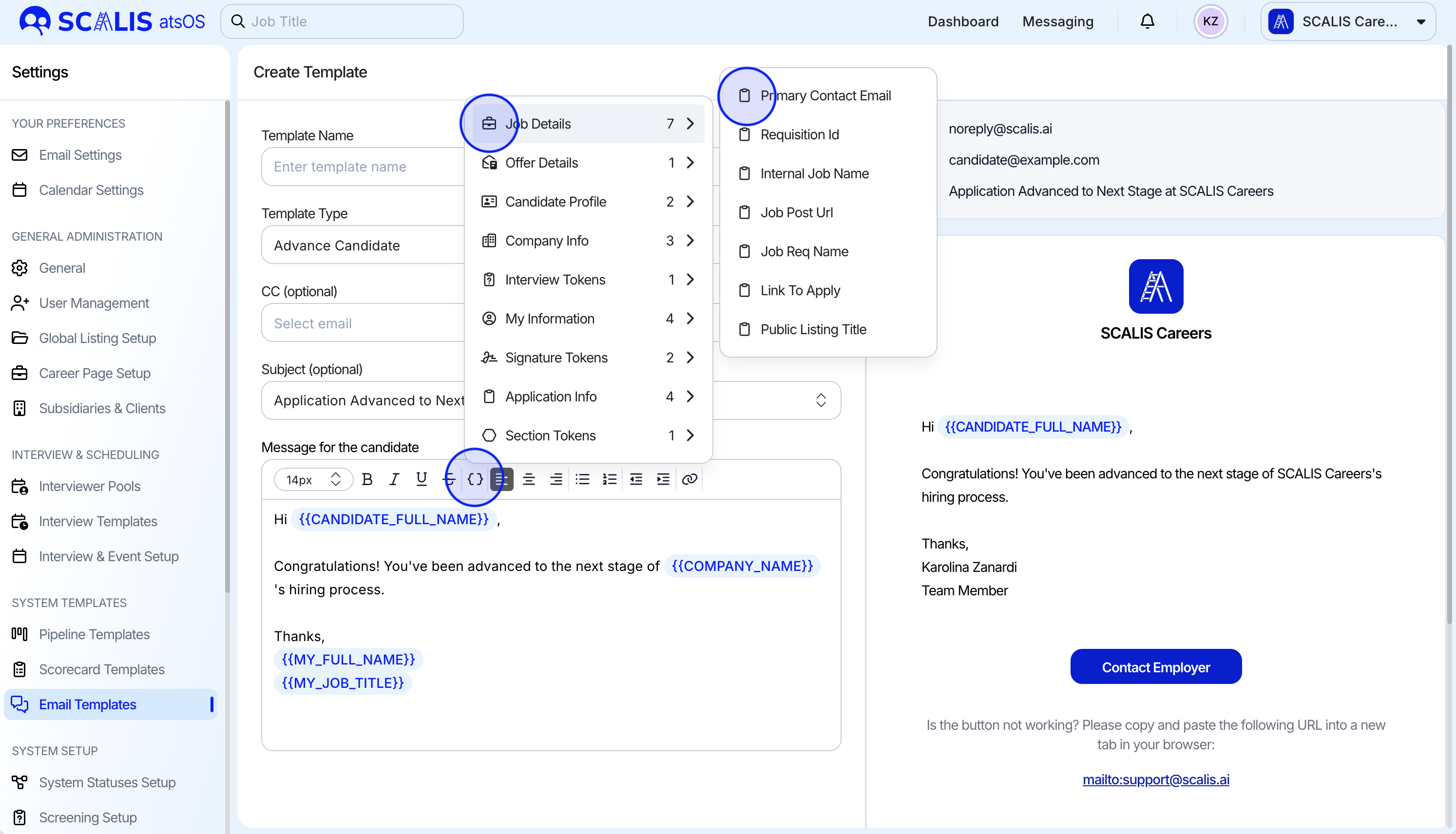 🔥 TIP: Use the {Tokens} in the dropdown menu to add in details that will auto-fill for each candidate.
