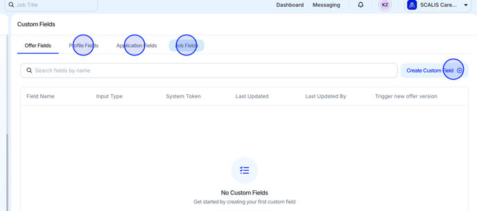 - Choose the field type you'd like to create (Offer, Profile, Application, Job), then click "Create __ Field".