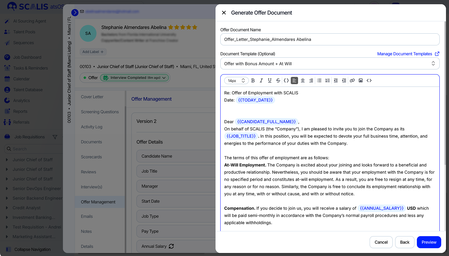 The document will auto-populate with tokenized offer details (e.g., candidate name, job title, salary).