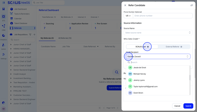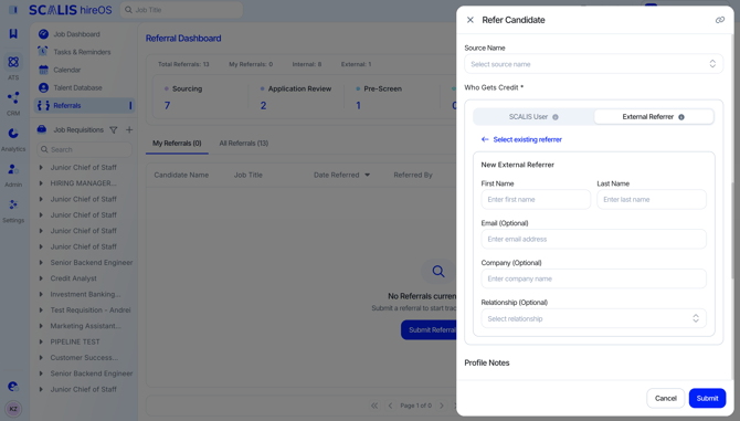 - Select if the Referrer is a SCALIS User (this person has a SCALIS account) or if they are an "External Referrer" (this is anyone outside of your company - recruiter, agency, personal contact, etc.)